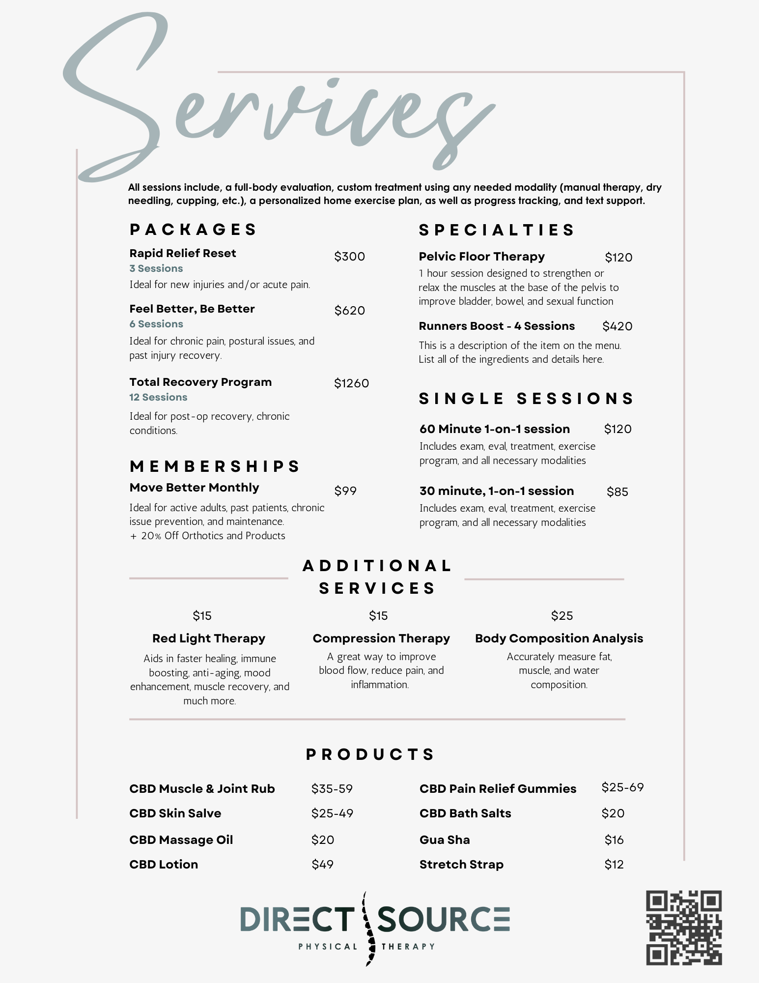Direct Source Physical Therapy is cash-based, so your care is simple, transparent, and built around your goals. Every session is one-on-one, focused on not just recovering from pain, but preventing it. Together, we’ll work on movement, body mechanics, and those everyday aches and pains that impact your quality of life.